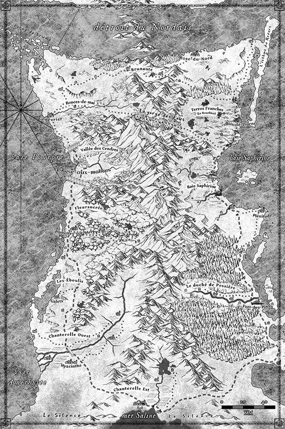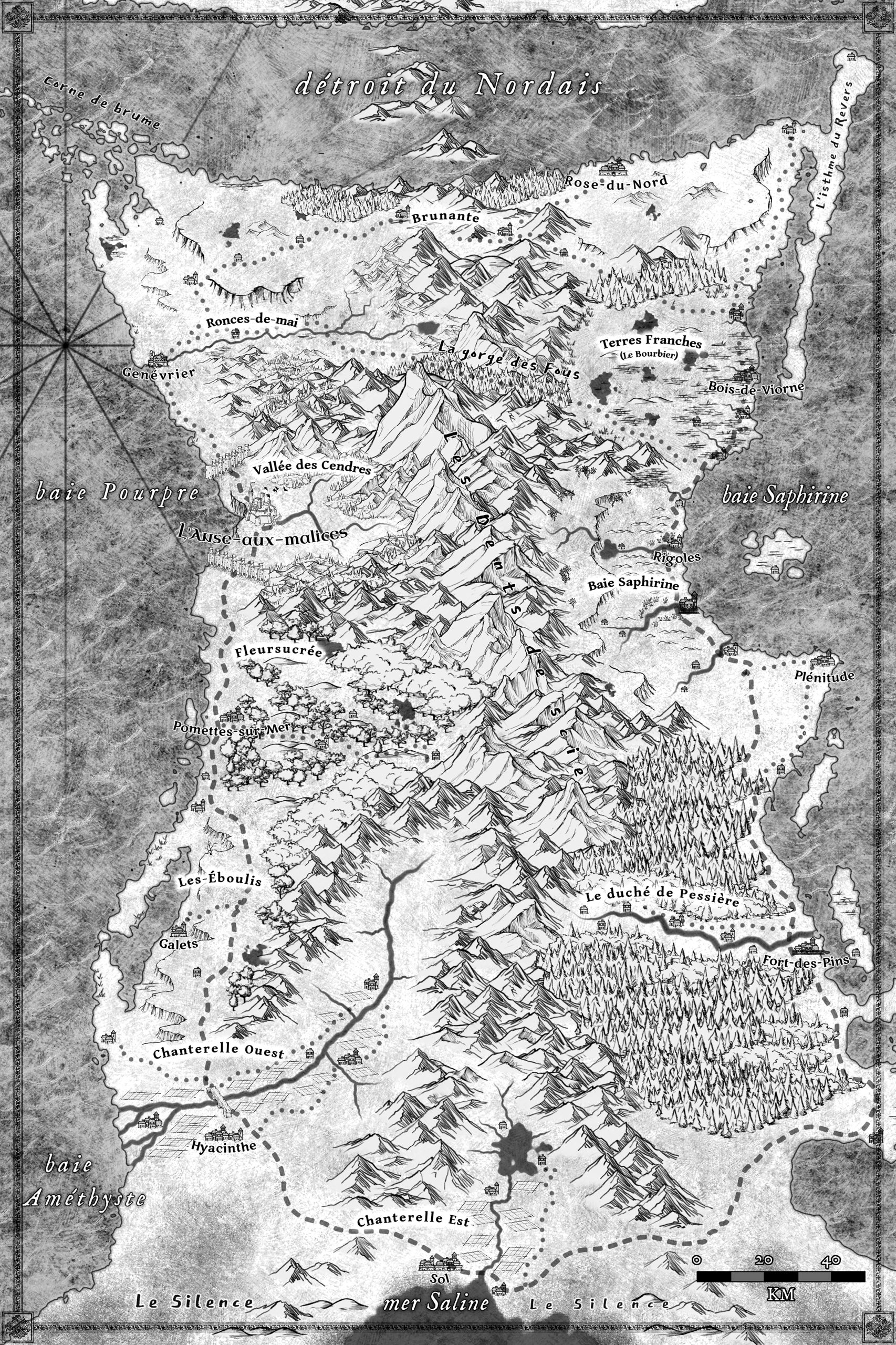 Au-delà des murs, exilés et désespérés tentent leur chance auprès des forêts d’aubépines vénéneuses, des montagnes acérées, des rivières sinueuses et impénétrables. Quelques villages et hameaux surplombent l’hinterland, où l’on pioche une terre pauvre, extirpant les ressources pour alimenter L’Anse-aux-Malices, toujours vulnérables et en proie aux Horreurs qui rôdent dans les marécages.